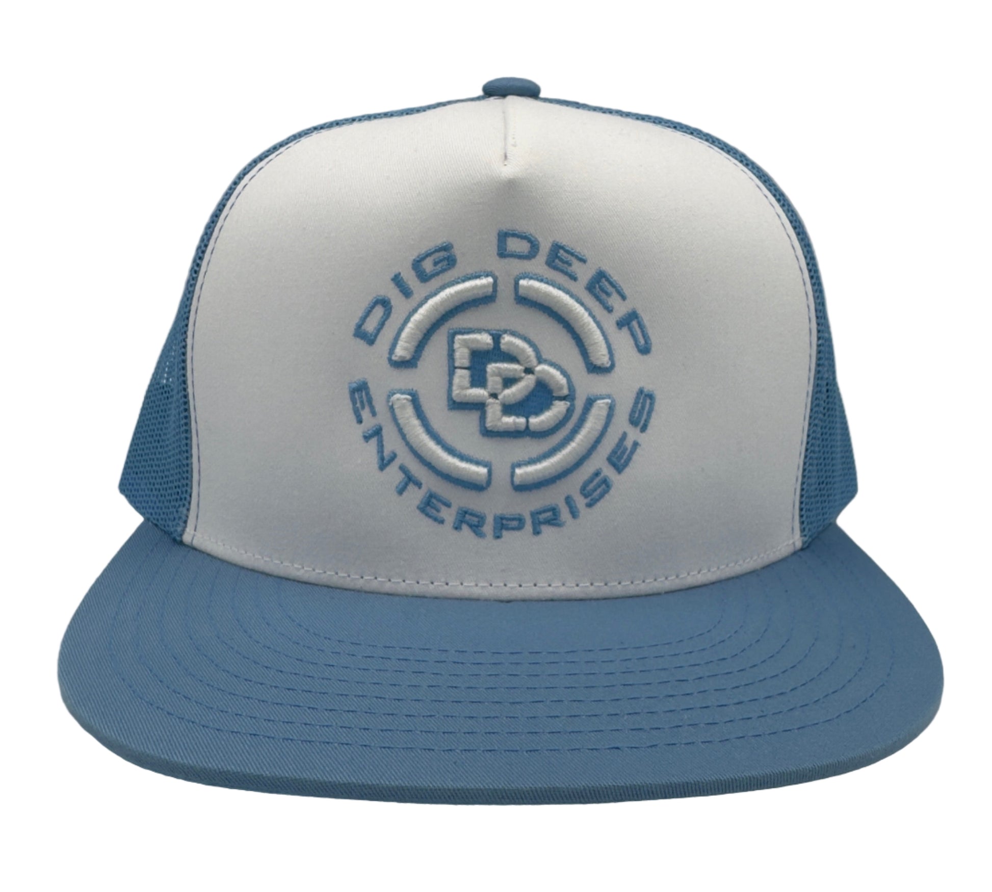 - BLUE HAT, WHITE FRONT PANEL, BLUE UNDER BILL, & BLUE MESH