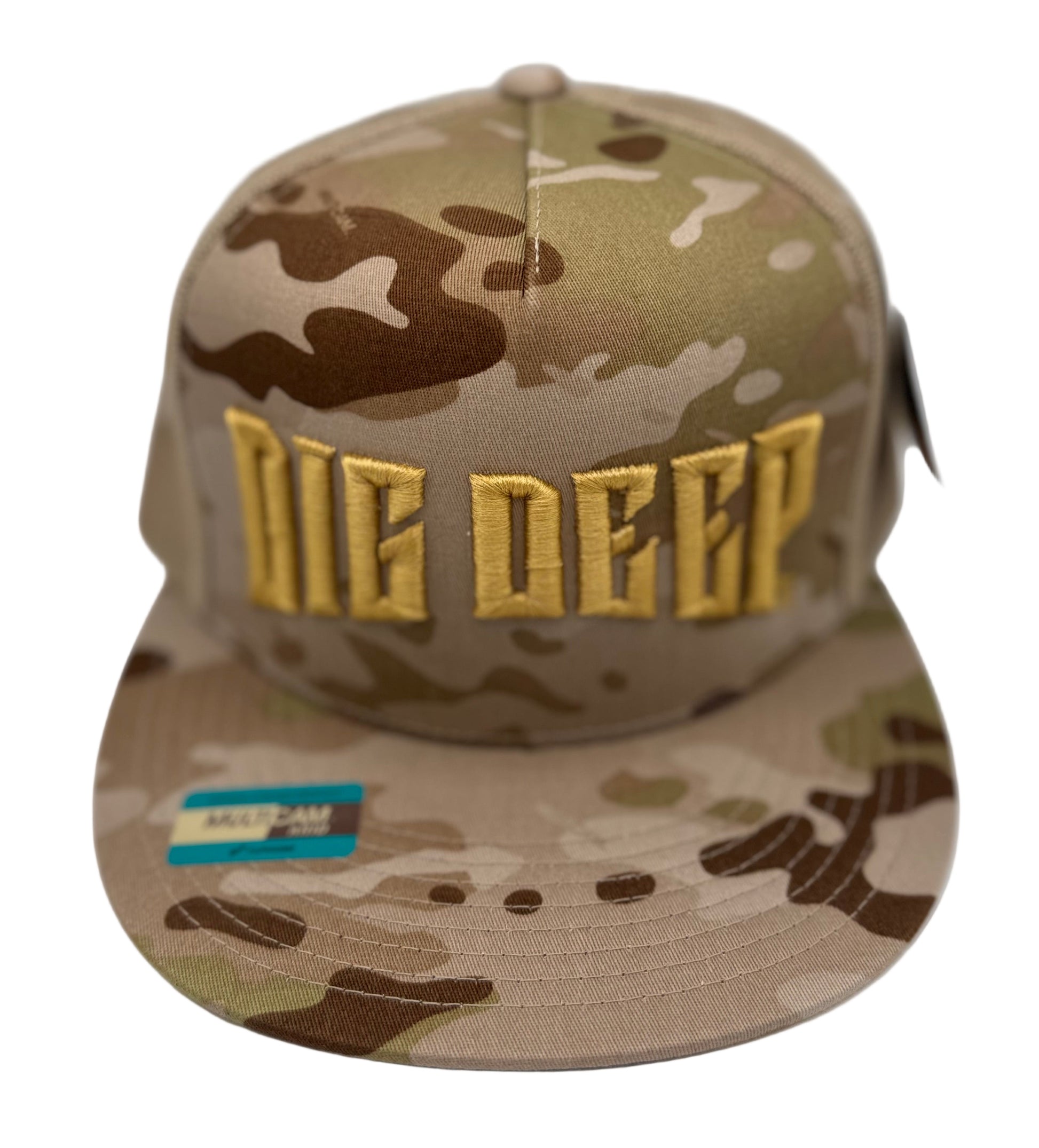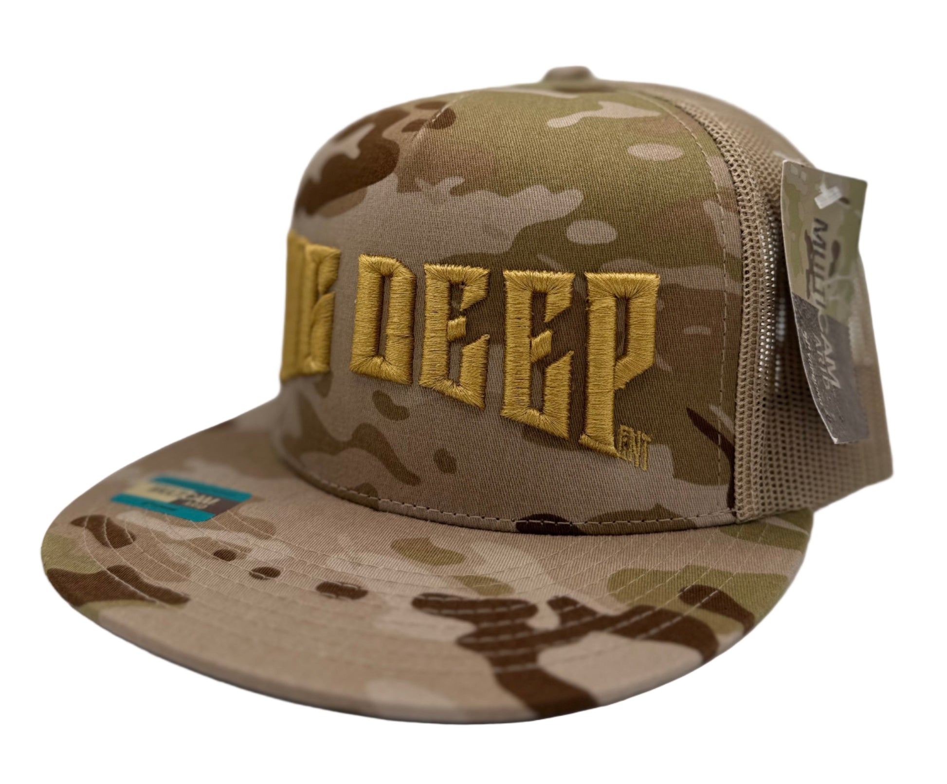 - TAN CAMO HAT & MESH, BLACK UNDER BILL